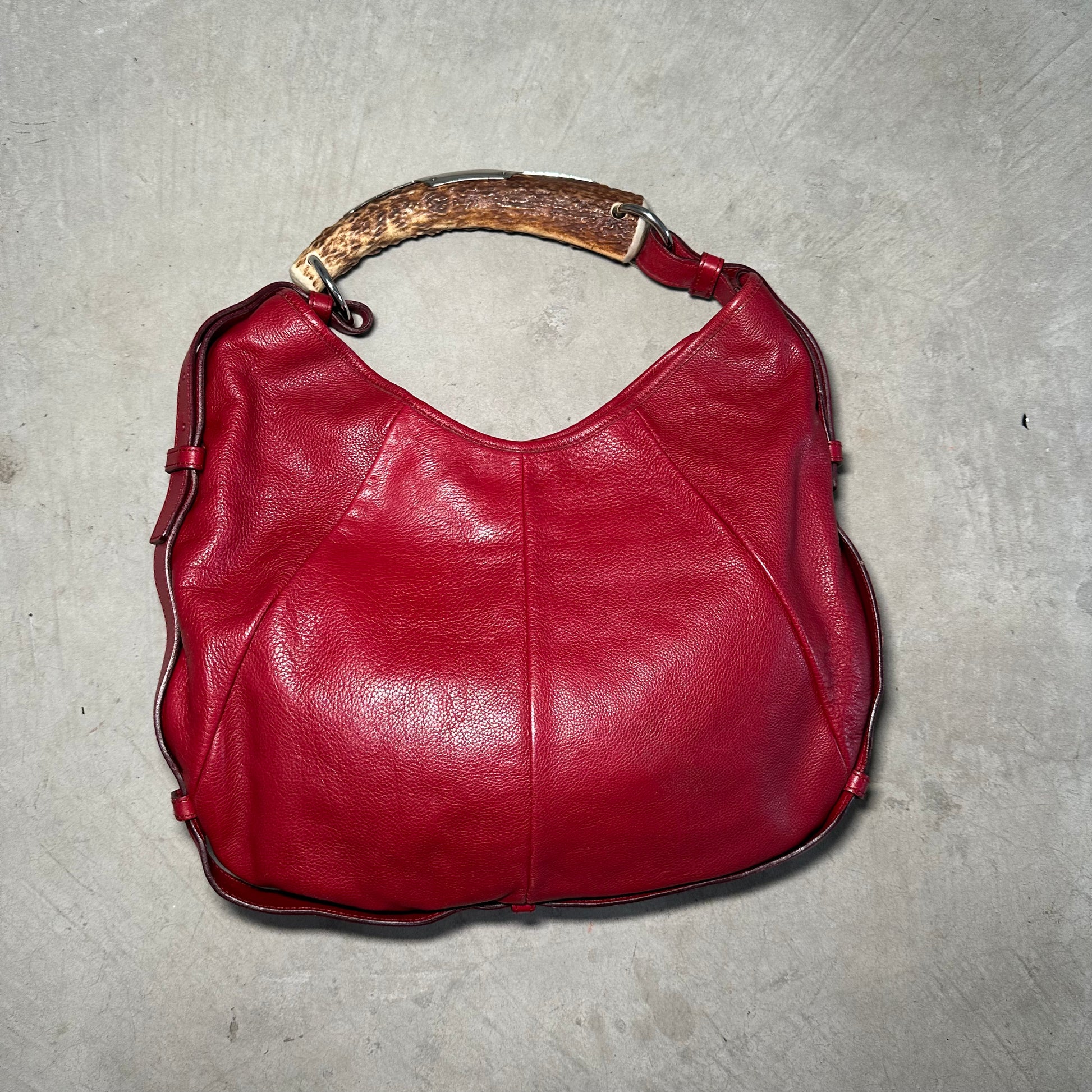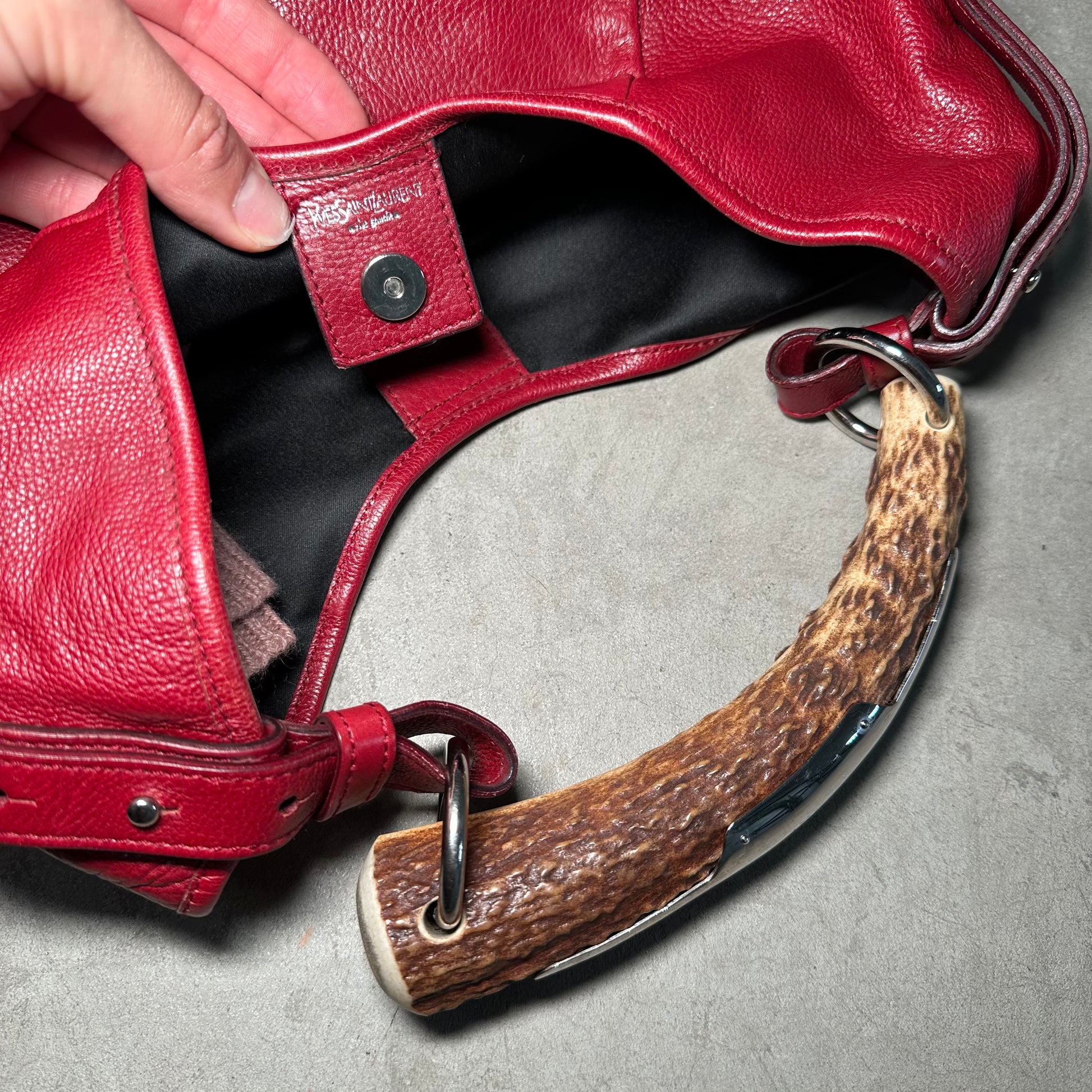 Gorgeous red YSL Mombasa from Tom Ford's iconic reign. Beautiful studded logo detail on the front. Real deer horn with sterling silver plate and tiny YSL logo etched.