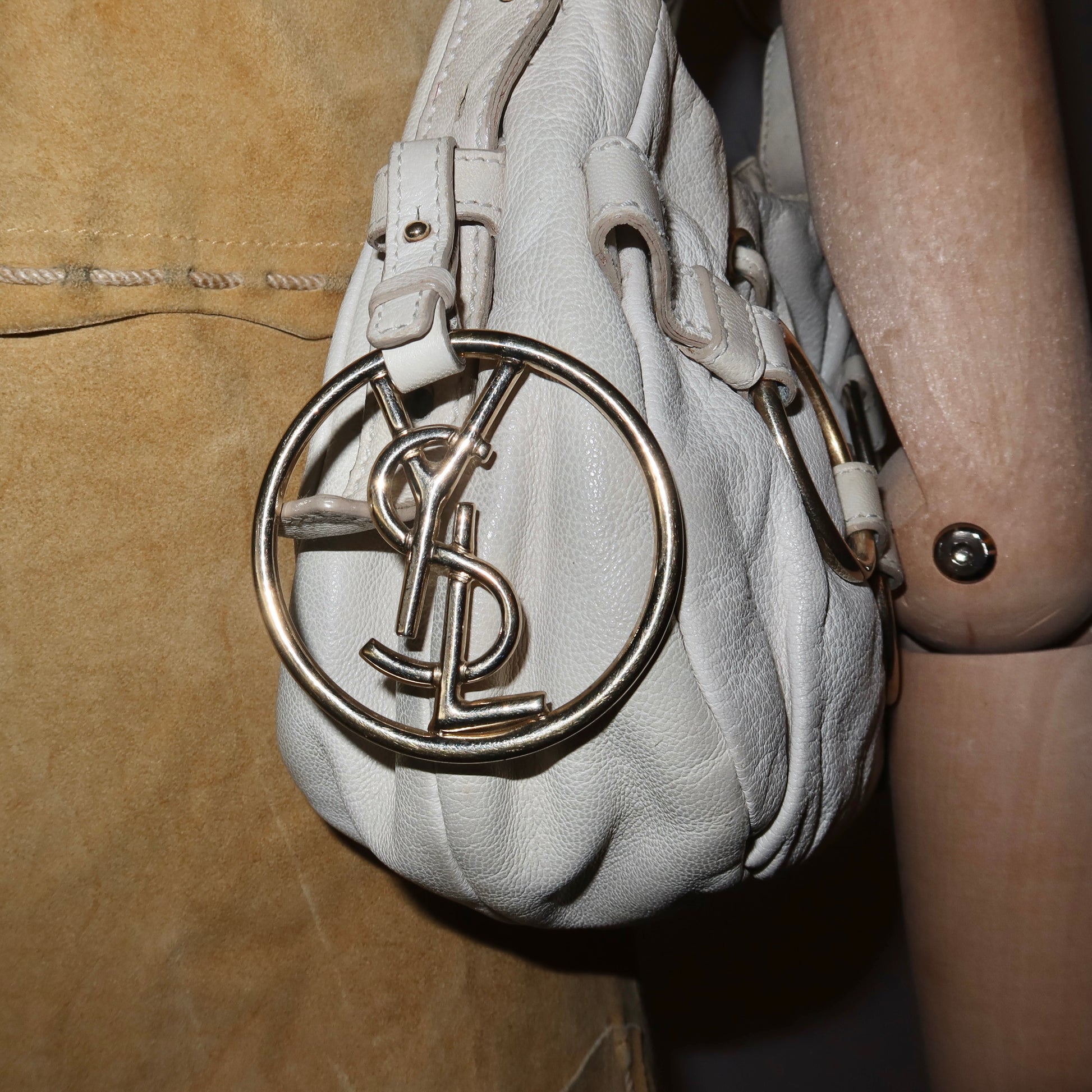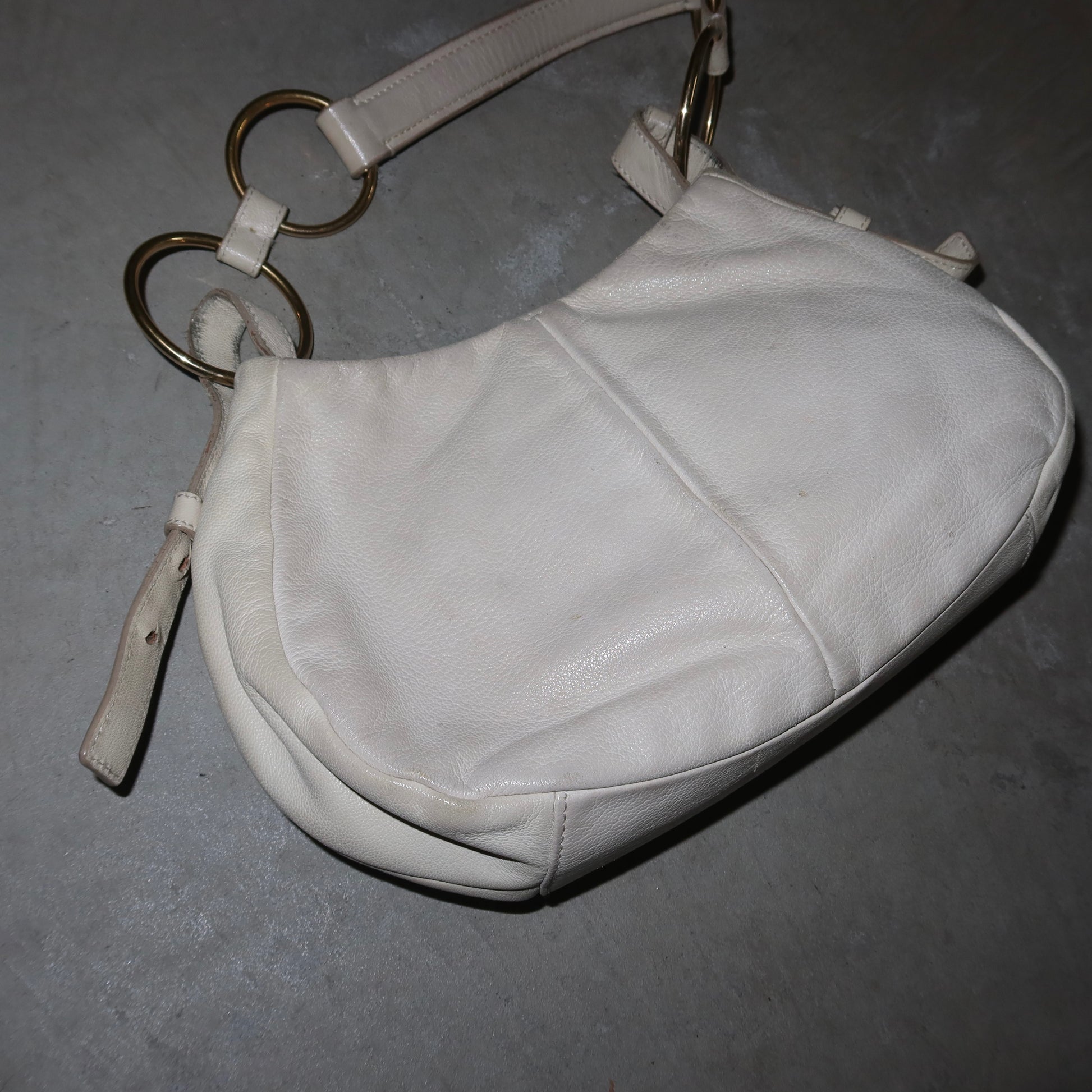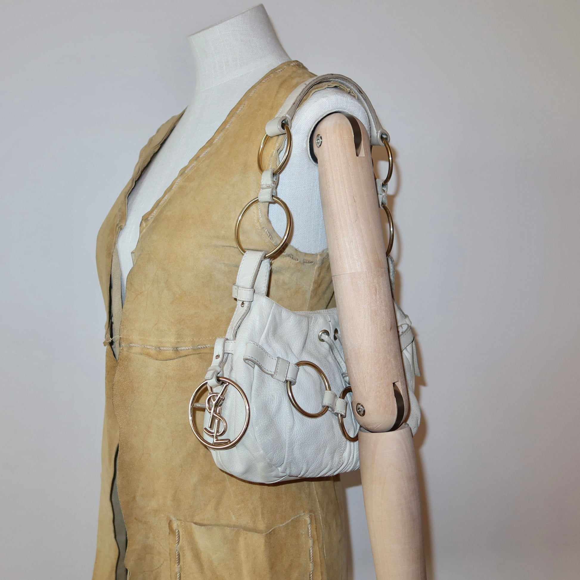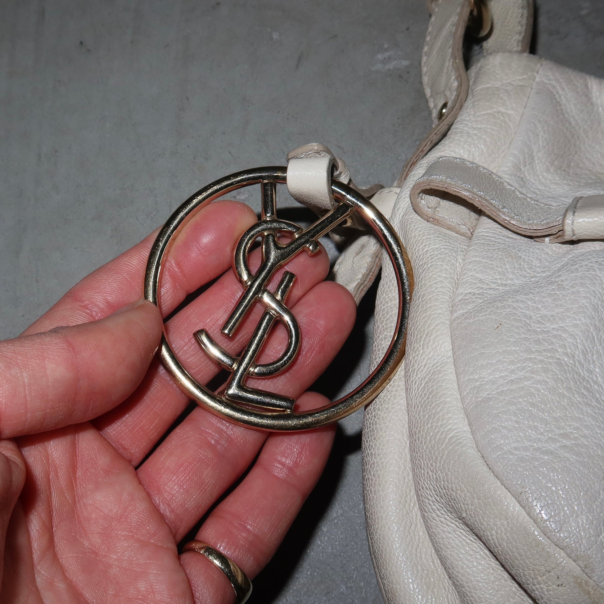 YSL by Tom Ford white Saharienne bag. Gold 60's style hoop hardware with oversized 'YSL' charm.