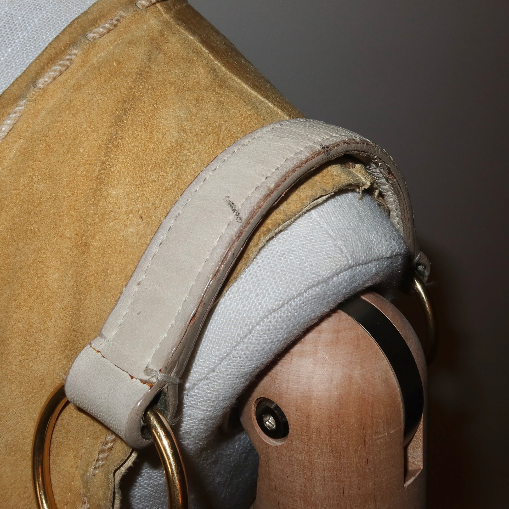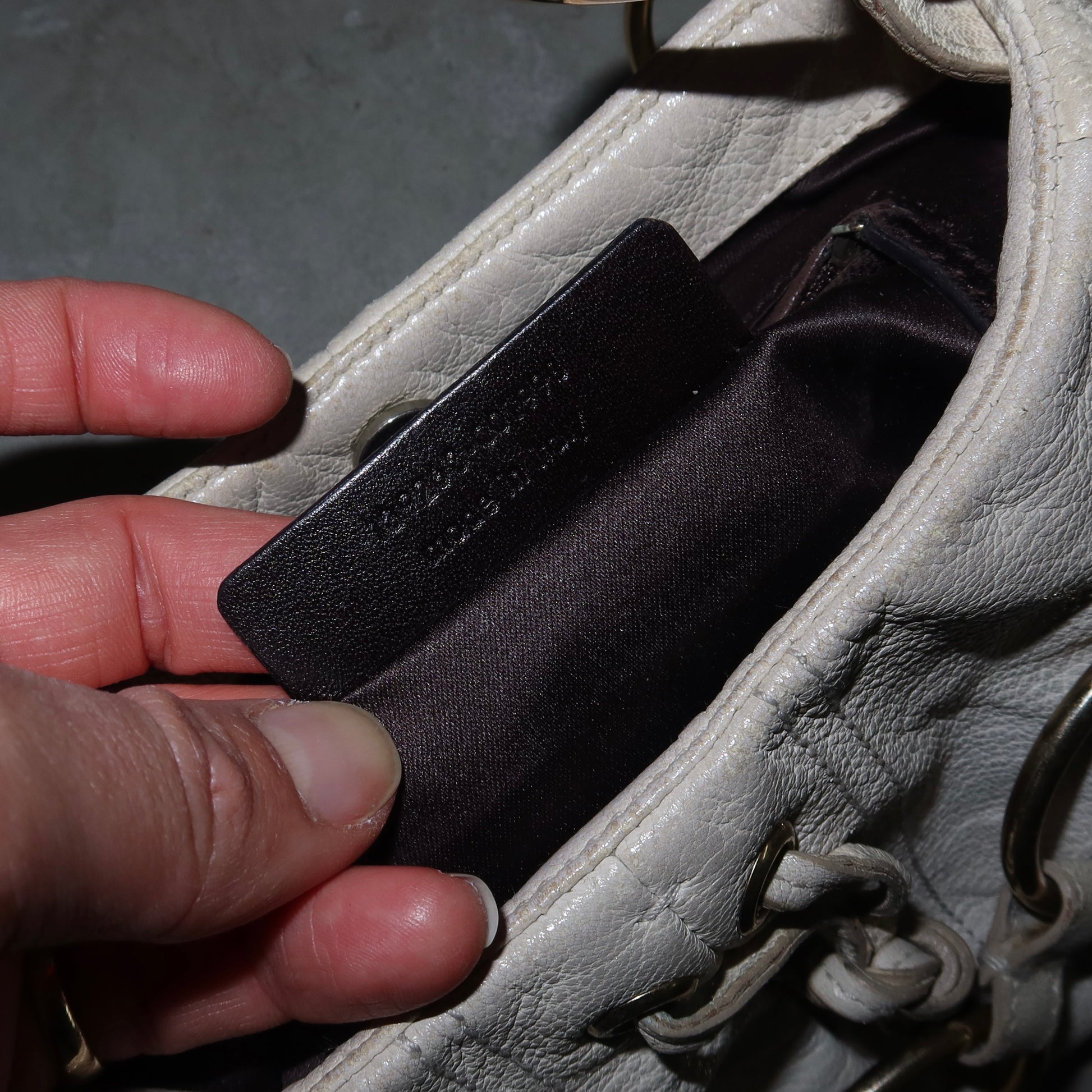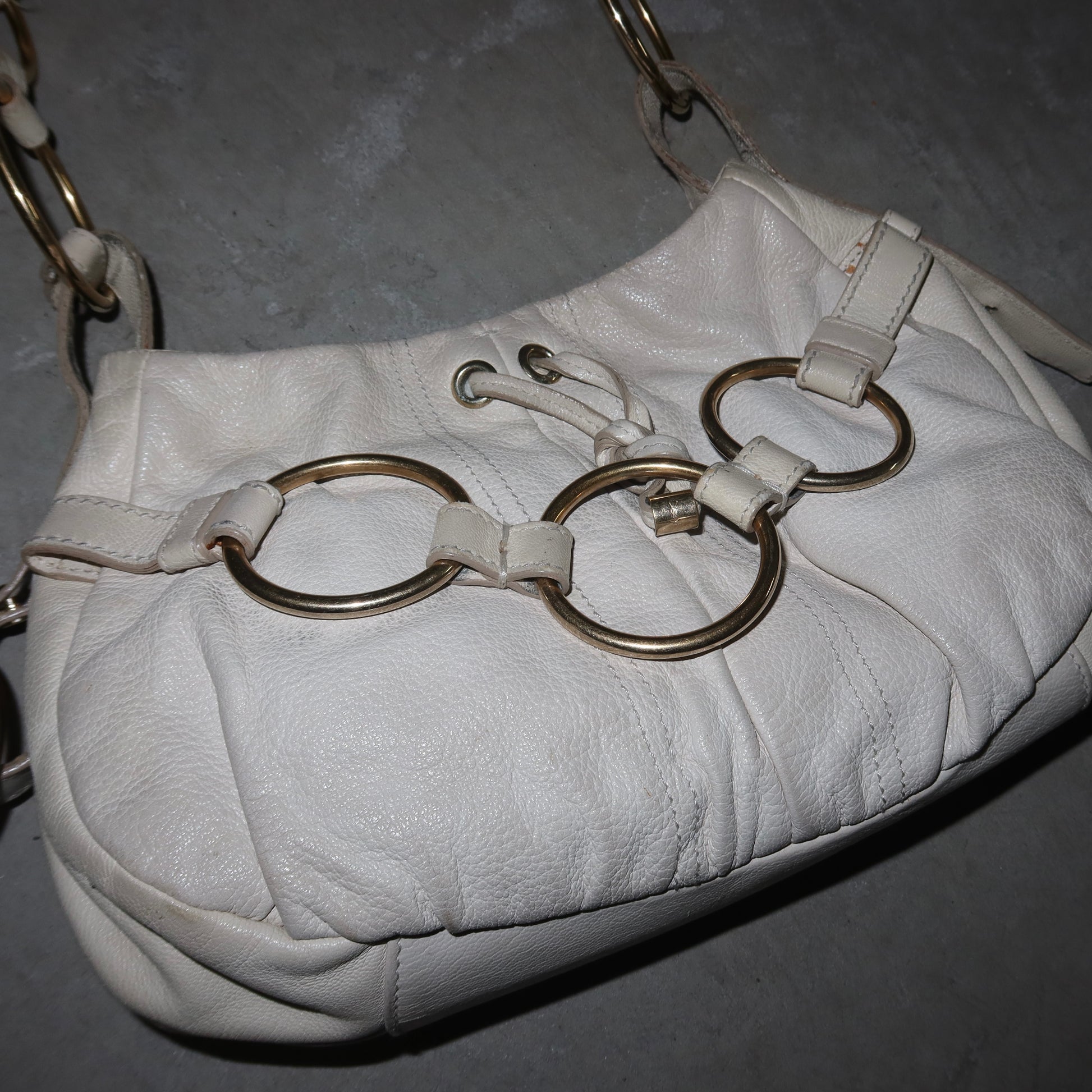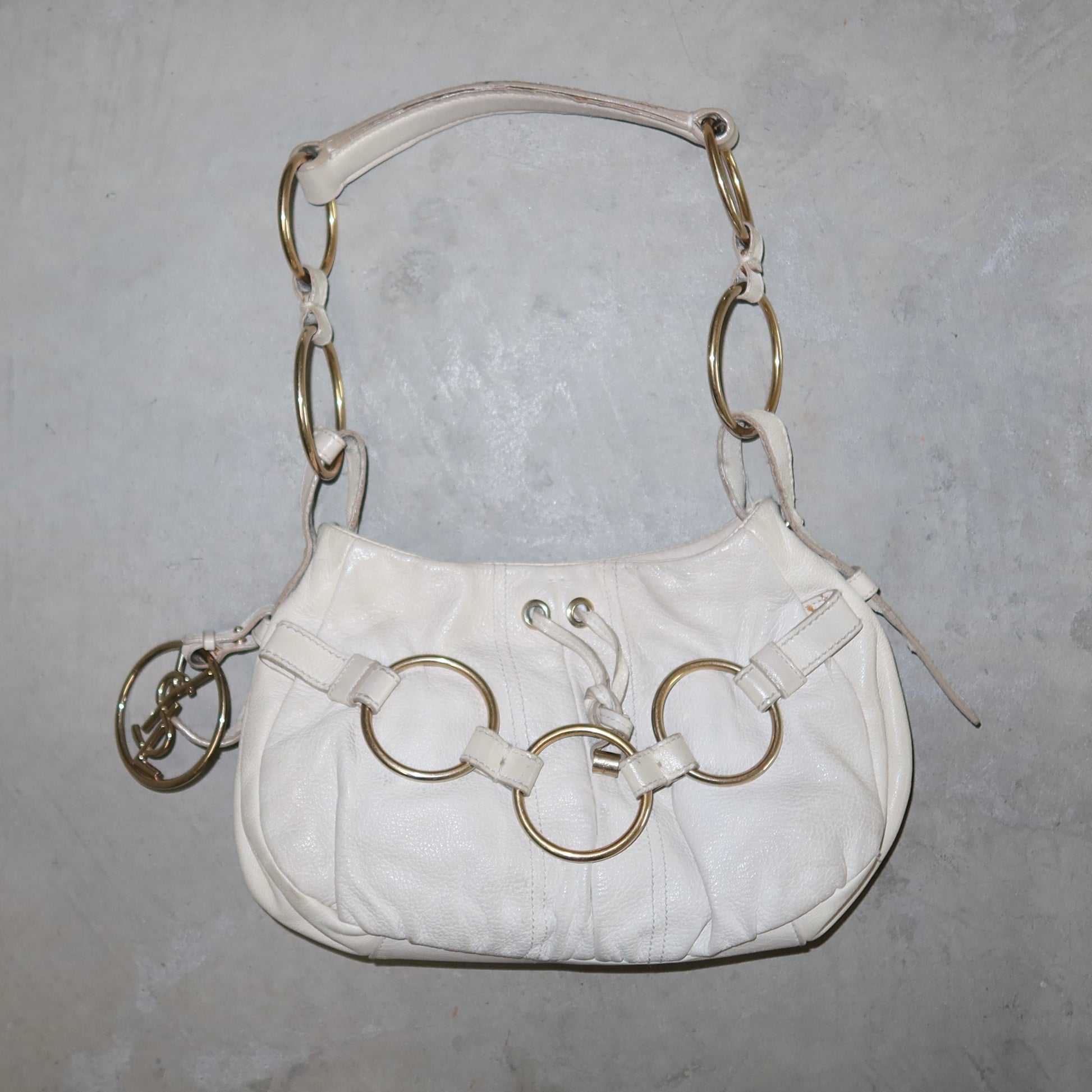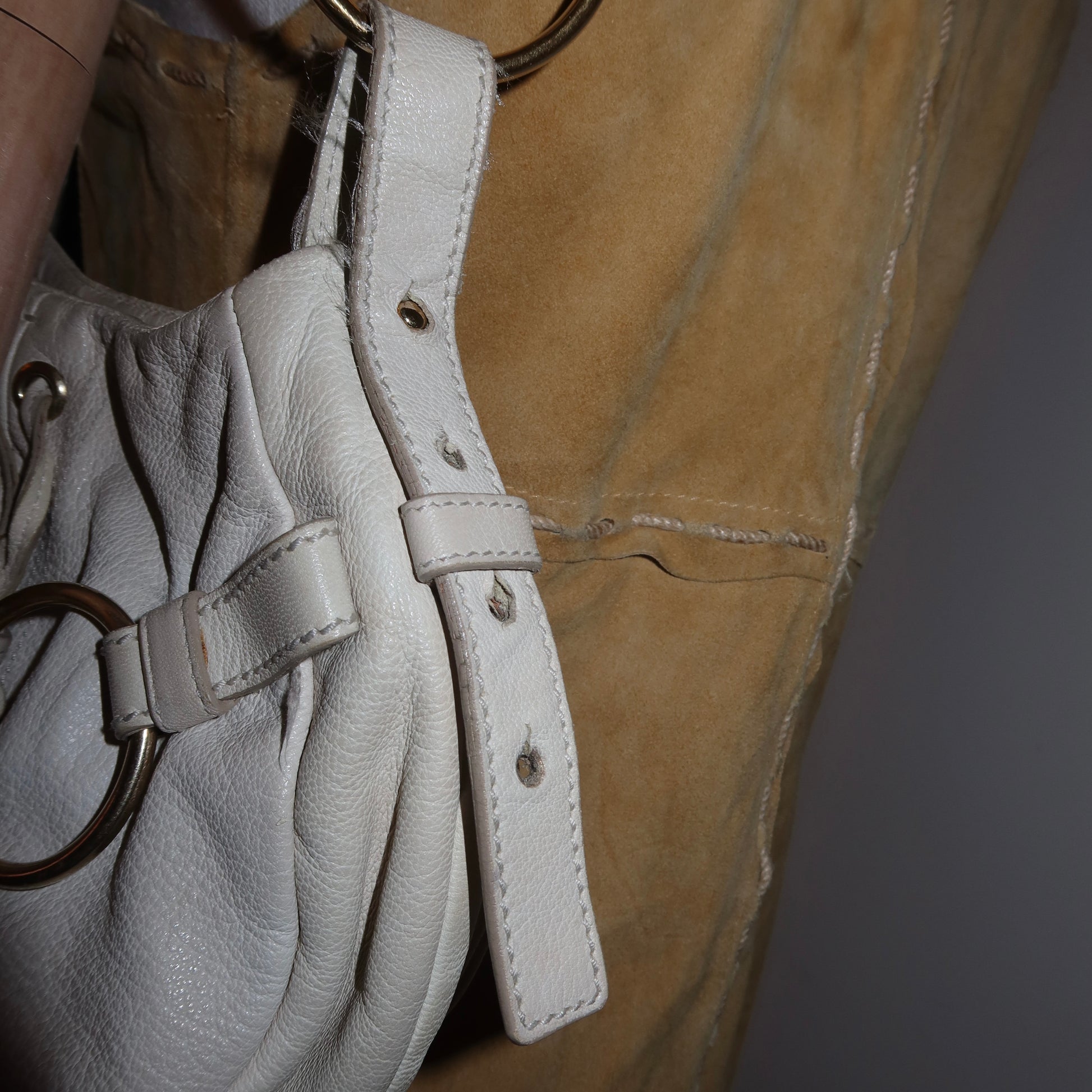 YSL by Tom Ford white Saharienne bag. Gold 60's style hoop hardware with oversized 'YSL' charm.