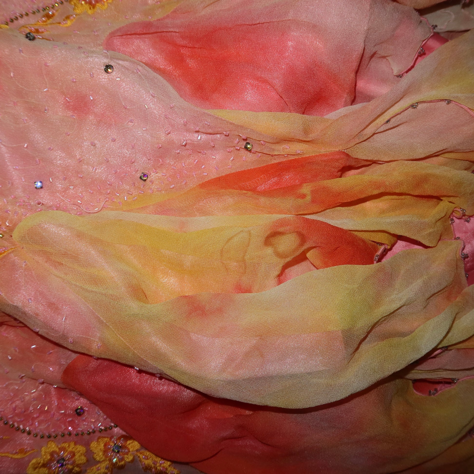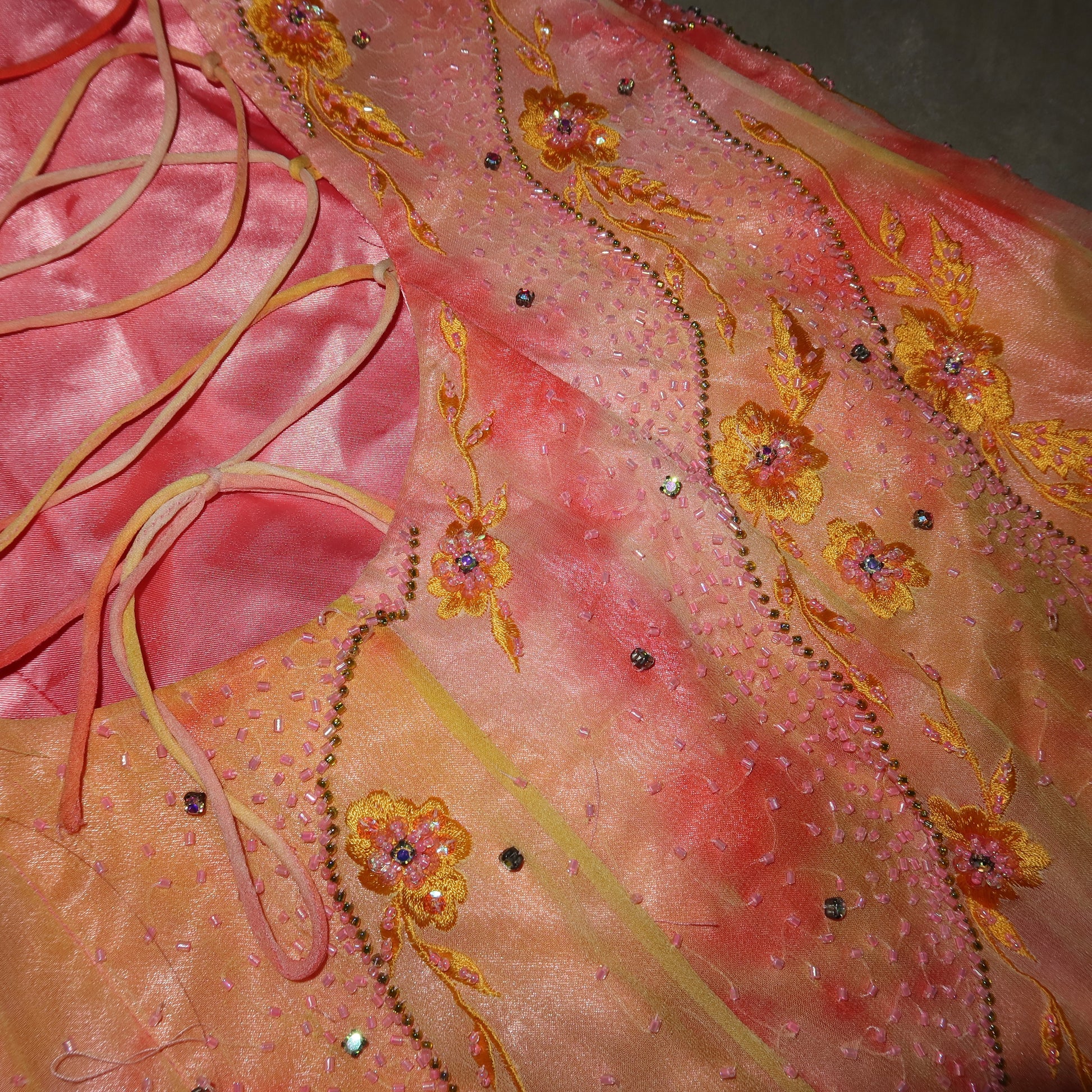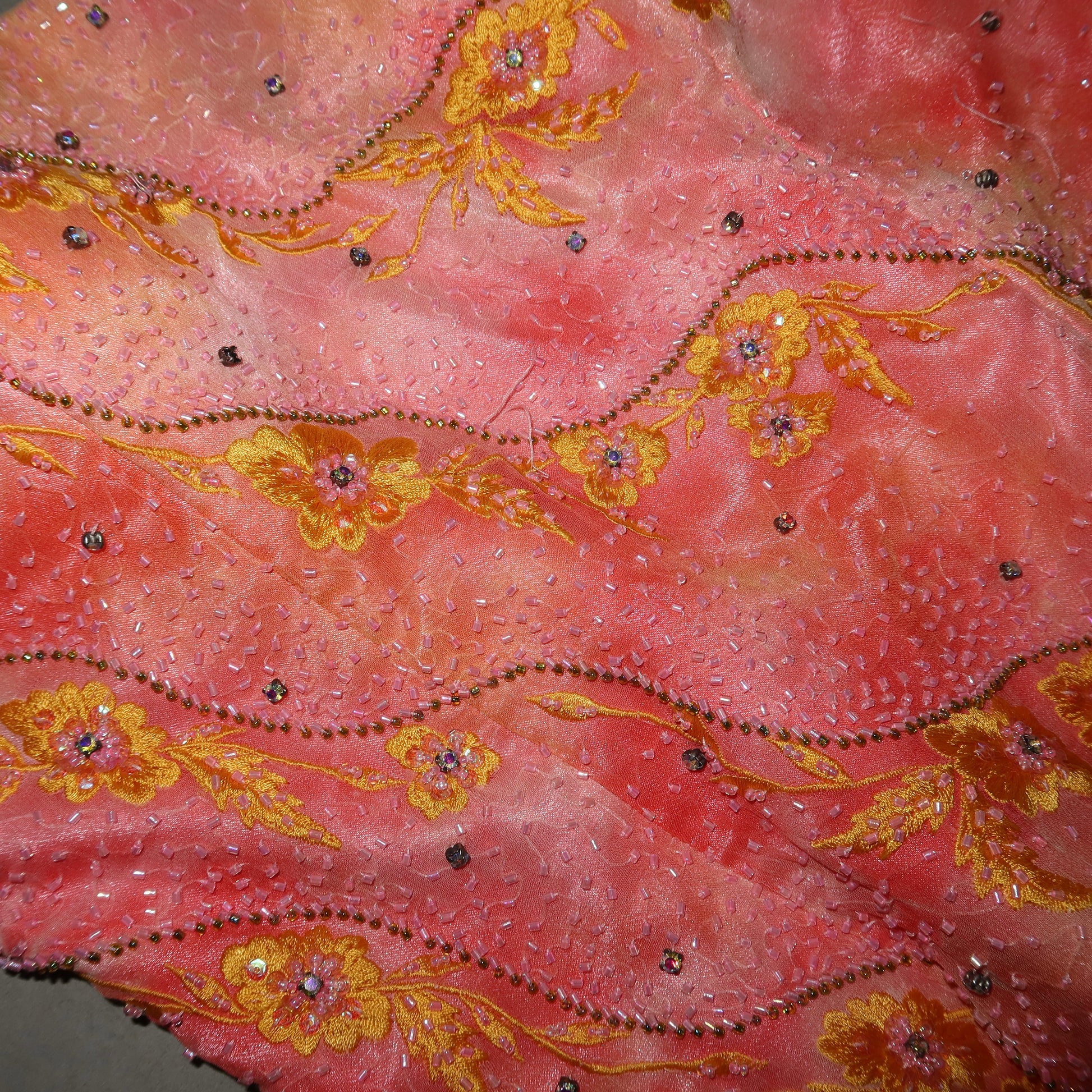 Good vintage condition. Missing beads here and there as pictured and small stain on fabric at hem that is fairly hidden by the print/colour.